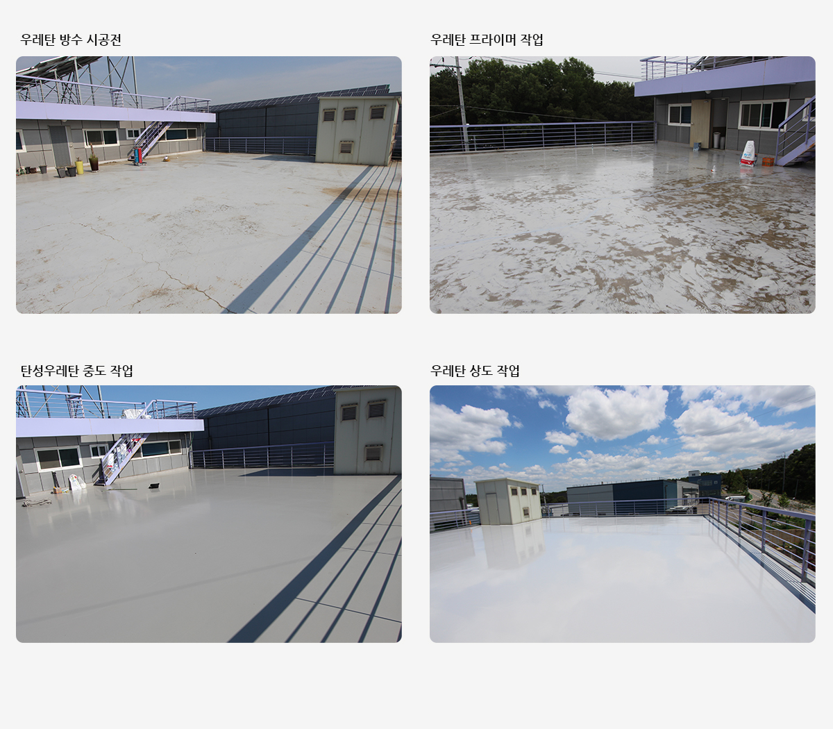 - 용도 - 빌라/ 빌딩/ 아파트/ 공장/ 테라스 등 - 특성 - 기존 우레탄 사용 연한이 경과 및 잘못된 시공으로 인한 문제가 발생시 재시공 한다. 방법은 전문가와 사용자간에 판단에 따라 기존 우레탄 전체 철거와 부분 철거가 있으며 철거 후 우레탄 시공은 기존 방수와 동일하다.